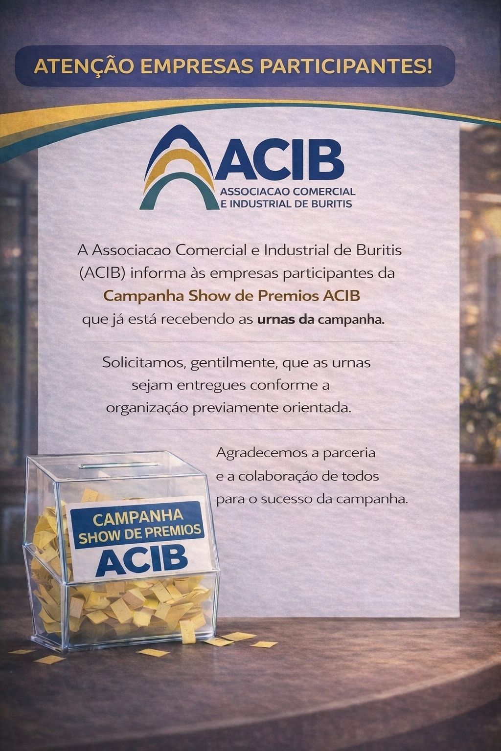 A Associação Comercial e Industrial de Buritis (ACIB) representa e apoia o desenvolvimento do comércio, indústria e serviços locais. Atua na defesa dos interesses empresariais, promovendo capacitações, eventos e campanhas que fortalecem a economia de Buritis. Oferece benefícios e oportunidades de networking aos associados. Mantém diálogo constante com o poder público, buscando melhorias para o setor produtivo. A ACIB é uma referência no incentivo ao empreendedorismo e ao crescimento empresarial no município.